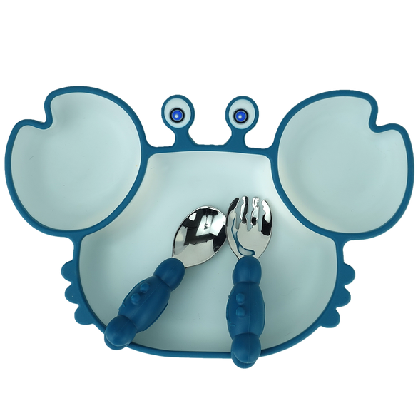 🦀 Discover mealtime fun with our Crab Suction Plate with feeding spoon and fork set. three compartments and secure non-slip suction bases. Plus, adorable crab cutlery ensures easy self-feeding. These silicone baby plates are perfect for hassle-free, enjoyable dining experiences, ideal for transitioning your baby to solid foods! waterproof bib for new born baby🍼👶